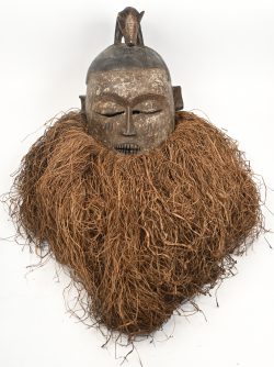 #417Een helmmasker van gebeeldhouwd en gebeitst hout. Voor initiatieritueel. Yaka, Kongo. voorzien van strooien tooi.