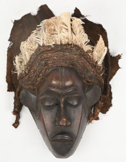 An Agbogho Mmwo, Maiden Spirit mask from the Igbo people of Nigeria. Decorated with monkey skulls at the bottom.Dim. h 93 cmEstimate: € 150 / 250 -