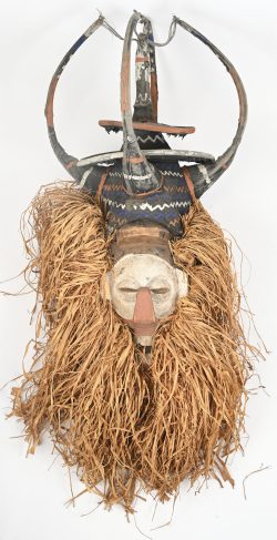 #497Een houten helmmasker met strooien hoofdtooi, getooid met een wild zwijn. Suku, Kongo.