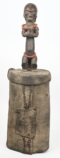 A wooden container with lid, carried by a kneeling woman. On the lid, two small kneeling women. Yoruba, Benin.Dim. h 83 cmEstimate: € 80 / 120 -