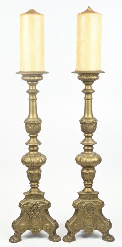 #193Een paar messingen kerkkandelaars naar barok voorbeeld.
