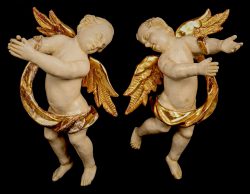 A pair of baroque wooden angels, white with gold-colored parts. 19th century.Dim. Hoogte 29 cmEstimate: € 60 / 90 -