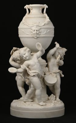 A biscuit figure/vase with music-playing angels. Marked KVE, first half of the 20th century. Restored at the base.Dim. h 33 cmEstimate: € 40 / 60 -
