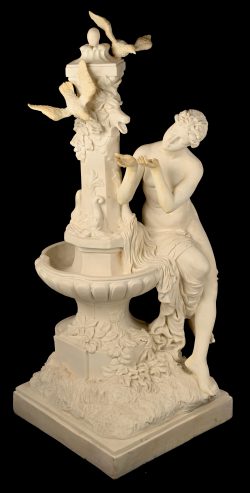 #123Een kunststoffen beeld met een halfnaakte dame aan een fontein.