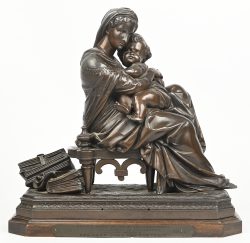 "Mother with child," a zamak sculpture on a wooden base, given to the chapel master of the Holy Sacrament in the St. Paul's Church in Antwerp.Dim. 29 x 30 x 14 cmEstimate: € 80 / 120 -