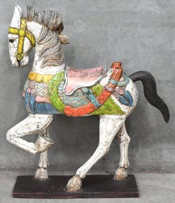 A polychrome carved wooden horse, inspired by the fairground horses of yesteryear.Dim. 110 x 95 x 26 cmEstimate: € 150 / 250 -
