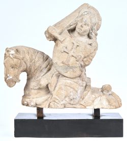 #58Een zandstenen beeldfragment van een ridder te paard. Naar middeleeuws voorbeeld.