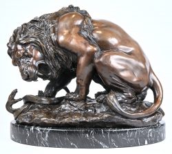 A lion fighting a snake, a patinated bronze sculpture on a marble base. In the style of Antoine-Louis Barye (1796-1875).Dim. H 35, B 42, D 24 cmEstimate: € 400 / 500 -