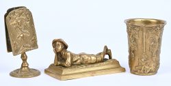 #267Een lotje brons bestaande uit een beeldje van een liggende jongen en een beker met luciferhouder uit het begin van de 20ste eeuw.