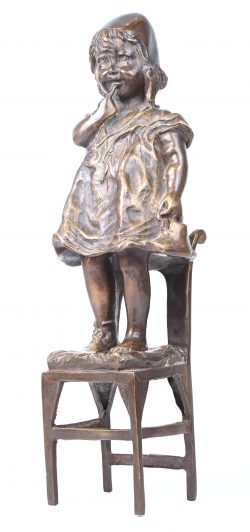 #227“Meisje op stoel”. Een brons gegoten beeldje, verso gesigneerd.