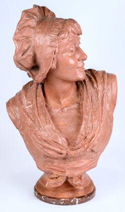 “Bust of a Young Woman,” a patinated plaster figure on a marble base. After the work by Alphonse Van Beurden.Dim. Hoogte 63 cmEstimate: € 80 / 120 -