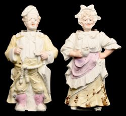 #277Een set van 2 figuren uit meerkleurig biscuit met knikkende hoofdjes. Duitse makelij omstreeks 1900. De hals van de dame is gelijmd en enkele kleine gebruikssporen.