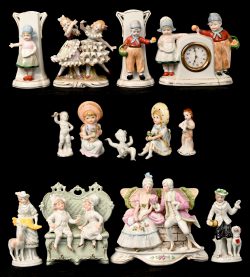 #199Een lot van 13 beeldjes uit porselein en biscuit met meerdere romantische voorstellingen en een Hollands klokje met 2 vaasjes.