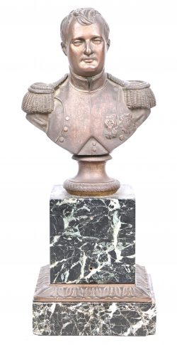 #528Een bronzen buste van Napoleon Bonaparte op een voet van groen marmer. Met schade aan de basis.