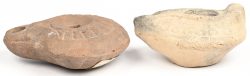 A lot of 2 ancient Roman pottery oil lamps with carved details. Presumably from the 3rd century BC.Dim. 9 cmEstimate: € 250 / 350 -
