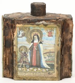 An 18th-century tea caddy, tin with paper and glass, depicting Saint Joanna as well as old Dutch. Needs restoration.Dim. 14 x 13.5 x 7 cmEstimate: € 120 / 160 -