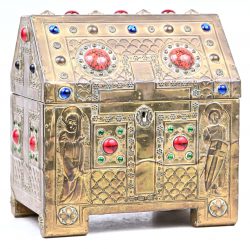 An old wooden treasure chest, adorned with copper and decorative stones, in the style of Alfred Louis Achille Daguet. Circa 1900.Dim. 20 x 19 x 13 cmEstimate: € 60 / 80 -