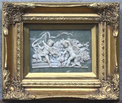 A high-relief with angels and flowers in a gilded frame.No longer availableDim. 26 x 31 cm (kader)Estimate: € 30 / 50 -
