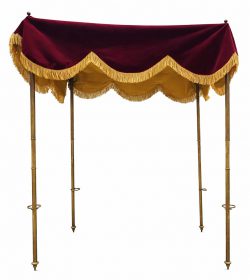 #108Een baldakijn met vier koperen palen, drie lederen draagriemen en een paarse fluwelen luifel.