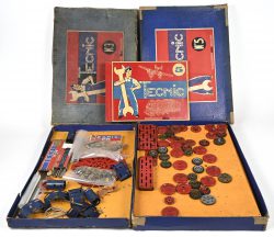 #193Een lot van 2 dozen vintage metalen speelgoed, Unica Kortrijk, Technic No 3 en No 5. Onvolledig.