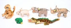 #189Zes pluche knuffels, één aap, één kikker, één krokodil, één nijlpaard en twee neushoorns,op de aap na allen gemerkt Steiff.