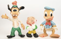 Goofy, Donald, and Blush. Three vintage squeak dolls with the 'Walt Disney Productions' elephant stamp.Dim. Hoogte 22-38 cmEstimate: € 70 / 110 -