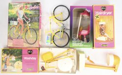 #187Vier vintage poppentoebehoren, bestaande uit een Barbie fiets, een Sindy haardroger, een Sindy droogrek en een Playwell haardroger. In OVP.