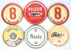 Six vintage metal advertising trays. Pilsor, Stolz, 2 X Super 8, Special Hey-Va, and Bass.Dim. Ø 32 cmEstimate: € 30 / 50 -