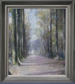 #303‘Bomendreef met vrouw op bank’, olieverf op doek. Getekend R. Carlé.