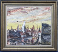 #152‘Vrachtschepen aan de kade’, olieverf op doek. Een postimpressionistisch werkje, getekend Dariss.