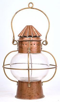 A copper lantern with a spherical glass hurricane.Dim. Hoogte 32 cmEstimate: € 25 / 40 -