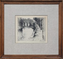 #284‘Zicht op sluis en brug’, een monochrome ets. Getekend A. Baertsoen.