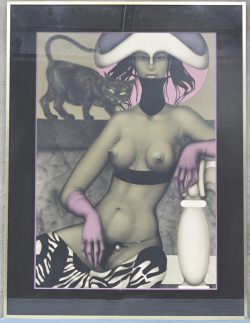 #489‘Vrouw met kat’, een kleurenloitho. Getekend Jef van Tuerenhout, nr. 38 uit een oplage van 96 exemplaren.