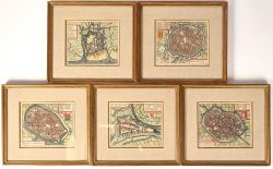 ‘Ostenda’, ‘Mechelen’, ‘Doornick’, ‘Limburg’ and ‘Bergen in Henegou’. Five colored antique city maps.Dim. 11/13 cmEstimate: € 100 / 150 -
