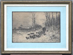#295‘Herder met zijn kudde schapen in de winter’, een opgehoogde ets. Getekend A. Ryckaert.