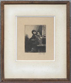 “Mother with Child,” a monochrome etching. Signed Rassenfosse, 1929. Artist’s proof.Dim. 21/14 cmEstimate: € 40 / 60 -