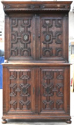 A solid oak 19th-century two-piece cabinet with paneled doors.Dim. 230 x 129 x 36 cmEstimate: € 120 / 180 -