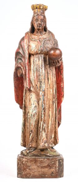 An 18th-century carved wooden polychrome statue of Mary, right hand missing.Dim. h 39.5 cmEstimate: € 100 / 150 -