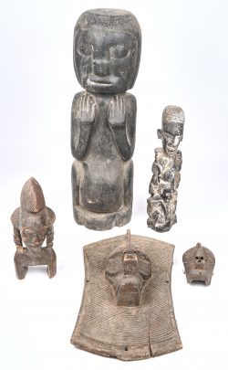 A lot of five African decorative objects.Dim. Hoogte 11-40 cmEstimate: € 40 / 60 -