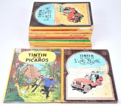 #261Veertien albums van Tintin. Ed. Casterman, hard cover. “Le Sceptre d’Ottokar” (1954), “Le Secret de la Licorne (1968), “Les 7 Boules de Cristal” (1961 & 1968), “Le Temple du Soleil” (1962), “Au Pays de l’Or Noir” (1961, 1963, 1971), On a marché sur la Lune” (1954), “Coke en Stock” (1961), “Les Bijoux de la Castafiore” (1963), “Vol 714 pour Sidney” (1975), “et les Picaros” (2 x 1976). De oudste in slechte staat.