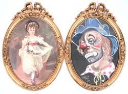 #265Een paar vergulde ovale lijsten versierd met een Lodewijk XVI strik bovenaan. De ene bevat een reproductie, de andere een clownsportret door Verelst d.d. 1999