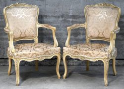 A pair of armchairs in Louis XV style, cream-colored lacquered and upholstered in light silk.Dim. H.86 cmEstimate: € 50 / 60 -