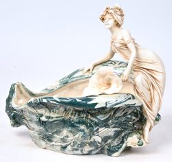 #403Een coupe van aardewerk in de vorm van een schelp me een lelie, een jonge vrouw op de rand. Ondraan gemerkt met de roze driehoek.