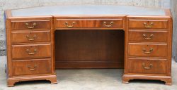 #176Een klassiek Engels bureau, grijs lederen blad, 9 lades en 2 deuren.
