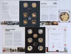 #78Twee fardes en één grote herdenkingsmunt, uitgegeven door het Belgisch Munthuis. In samenwerking met ‘In Flanders Field Museum’ en het ‘Bastogne War Museum. Uit elke farde ontbreekt één munt. Koper/nikkel met verzilverde en vergulde delen.