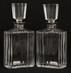 #181Een set van 2 kristallen karaffen met zilveren kraag, gemerkt A925 sterling. 25 gram en 26 gram zilver.