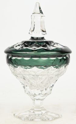 A crystal candy dish, green stained in the mass, signed Val Saint Lambert and M.No longer availableDim. h 25 x Ø 14.5 cmEstimate: € 50 / 70 -