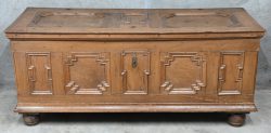 An antique solid oak trunk. The year 1789 is engraved inside.Dim. 67 x 154x 58 cmEstimate: € 150 / 250 -