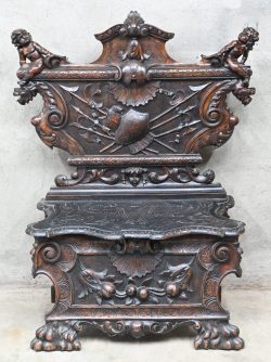#136Een massief houten zitbank in Renaissance stijl, weelderig snijwerk met putti en wapentuig. Op leeuwenpoten.