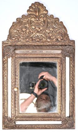 #124Een spiegelkastje gedecoreerd in koper bekleed.